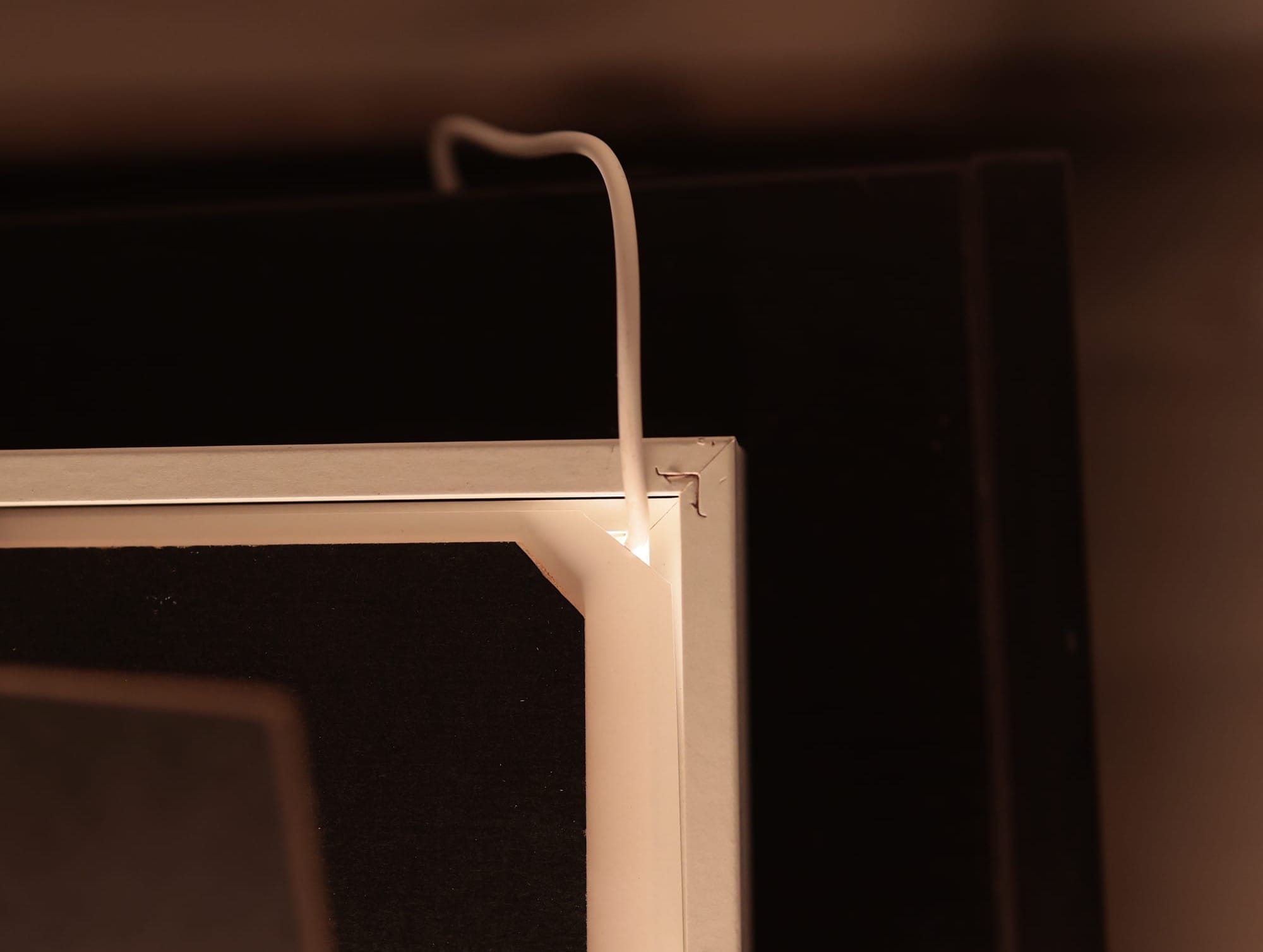 After sticking the main strip, use the double sided tape provided with the LED strip to secure the connector to the base of the frame. Use additional wire supporters to place the rest of the wire inside the frame and take it out from the nearest corner.